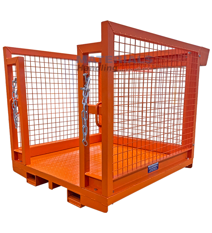 This model features a removable back that helps to access stock when required. The cage also has harness anchor points for added safety when lifting to protect the operator. Additionally, the unit is fitted with pallet grab brackets. It is finished in bright orange enamel paint.