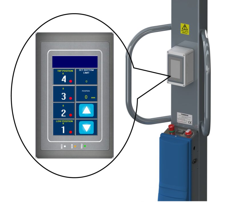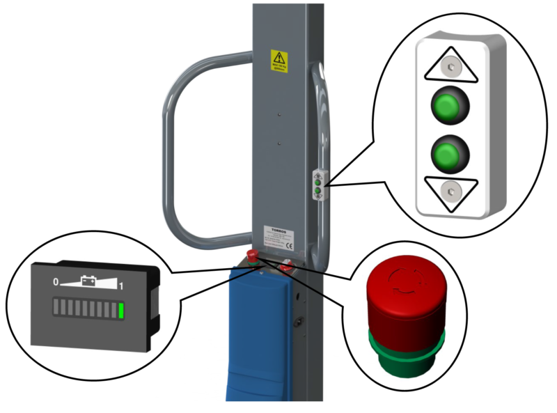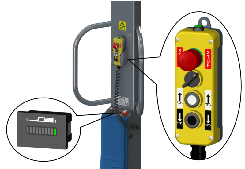 The basic function of a Multilift is the up and down of the carriage in the mast. The comfortable handset with spiral cable controls the lift and lower functions. Gripping tools with powered functions such as grip / release of rotate left / right will require a handset with extra push buttons.