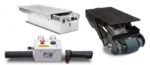 The Motorised Fifth Wheel kit includes a large polyurethane drive wheel, slide-out battery carriage, battery charger and an ergonomically designed hand grip. The powered system works collectively with the other four wheels to move heavy loads without effort. The handlebars on the human interface can be configured to adapt to almost any trolley or hospital bed.
