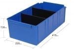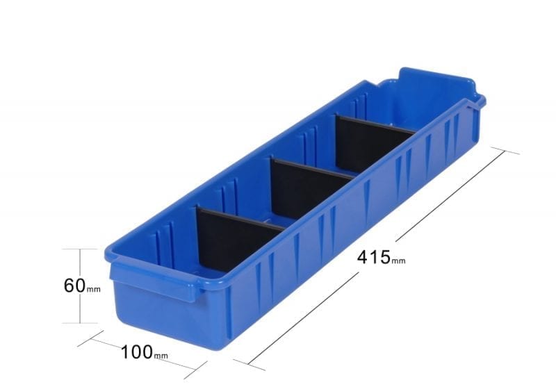 The entire range consists of seven sizes with five models 415 mm deep. These sizes suit our 900 mm x 400 mm panel shelving. Some dividers are supplied with the trays with additional dividers ordered separately. These trays also complement our heavy-duty industrial cupboards.